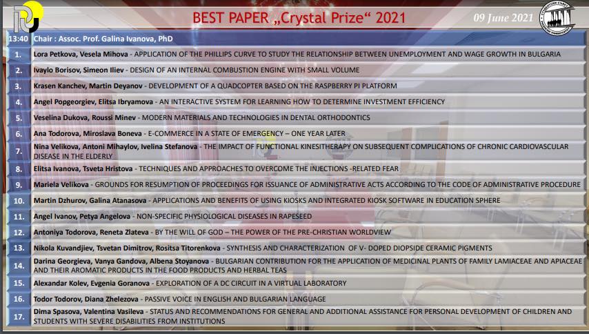 Участие в The Best Paper ,,Kristal Prize" 2021,Scientific Session for Students, PhD Students and Young Scientists