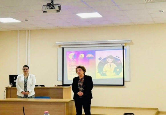 Доц. Деспина Георгиева запозна аудиторията със значимостта на хигиенните грижи при тежко болните, като акцентира значението на тяхното правилно извършване за превенцията на Инфекциите свързани с медицинското обслужване(ИСМО). Тези инфекции често възникват поради намален имунитет, нарушена цялост на кожата и лигавиците, продължителен престой в болнична среда и използване на инвазивни медицински процедури. Поддържането на чистота на тялото отстранява микроорганизмите, потта, секретите и мъртвите клетки, които създават благоприятна среда за развитие на бактерии. Почистената кожа запазва своята бариерна функция и предотвратява проникването на патогени. Допринася и за предотвратяването на рани от залежаване (декубитални язви).