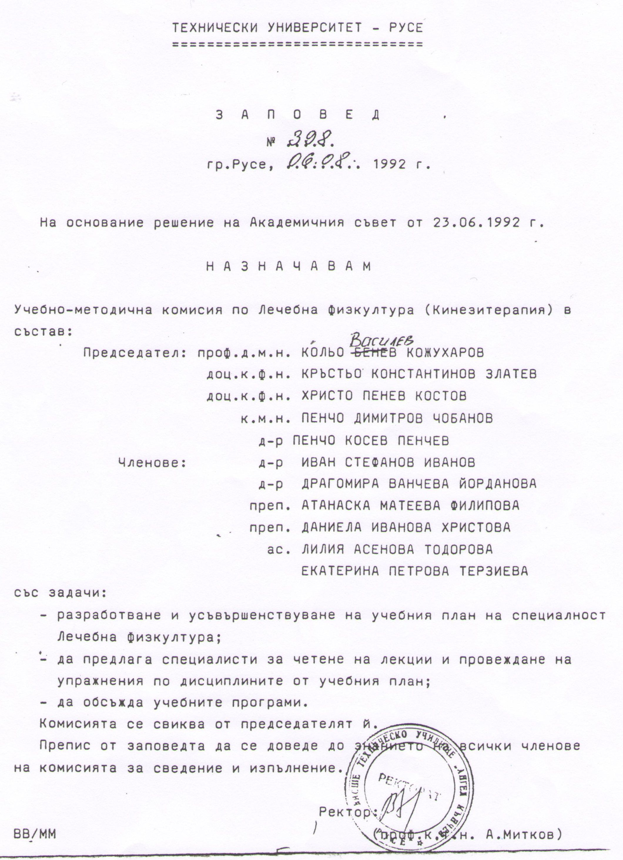 Заповед №398 от 06.08.1992 г. за назначаване на учебно-методична комисия по Лечебна физкултура (Кинезитерапия)